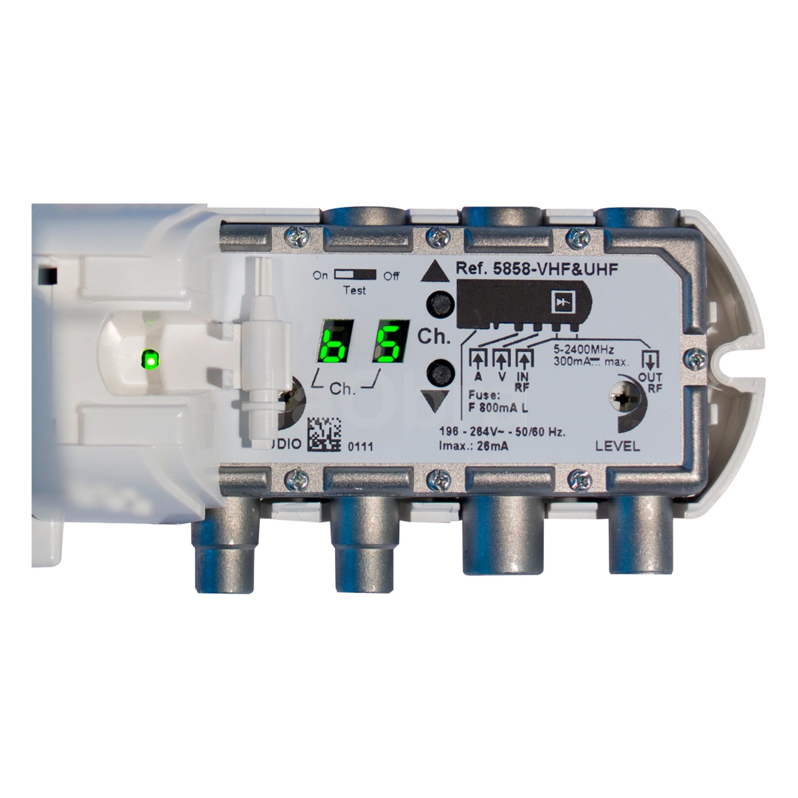 - Capaz de generar una señal de «test» (compuesta por dos bandas blancas) que permite localizar el canal generado en la red, en ausencia de una fuente de señal.