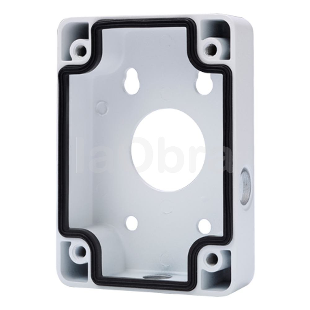 Permite alojar el alimentador, el cableado y los accesorios de la instalación en su interior. Usado con un modelo de domo motorizada compatible, la propia placa de anclaje del soporte de la cámara sirve de cubierta para la caja de conexiones. Fijación a pared. Permite el paso interno del cableado.