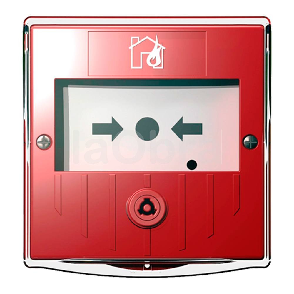 Pulsador de incendio en color rojo, rearmable mediante llave y con tapa.