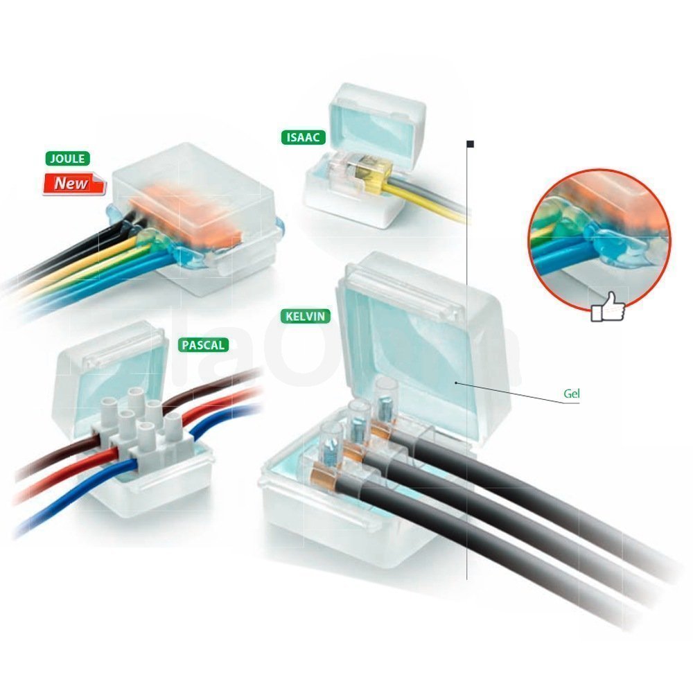 En laObra.es tenemos disponible los sistemas de uniones de las mejores marcas del mercado, aquí puede comprar el modelo Gel box Line Pascal Joule Kelvin para el empalme para cables eléctricos. Cajas estancas pre-rellenadas con gel reticulado para sellar, proteger y realizar conexiones eléctricas seguras.