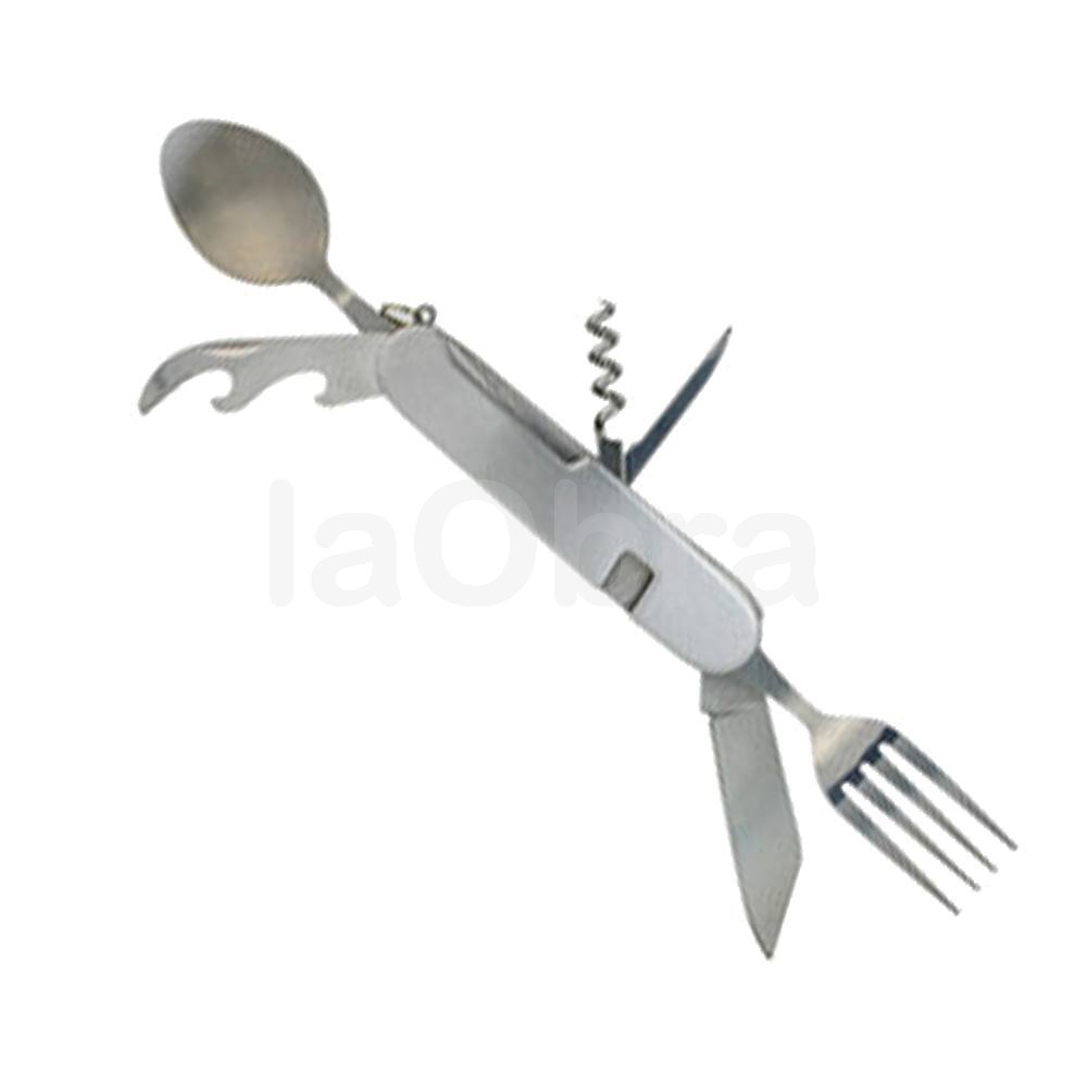 - 8 funciones: Perforador de cuero, Sacacorchos, Navaja, Abrelatas, Abrebotellas, Tenedor, Cuchara, Aro llavero
