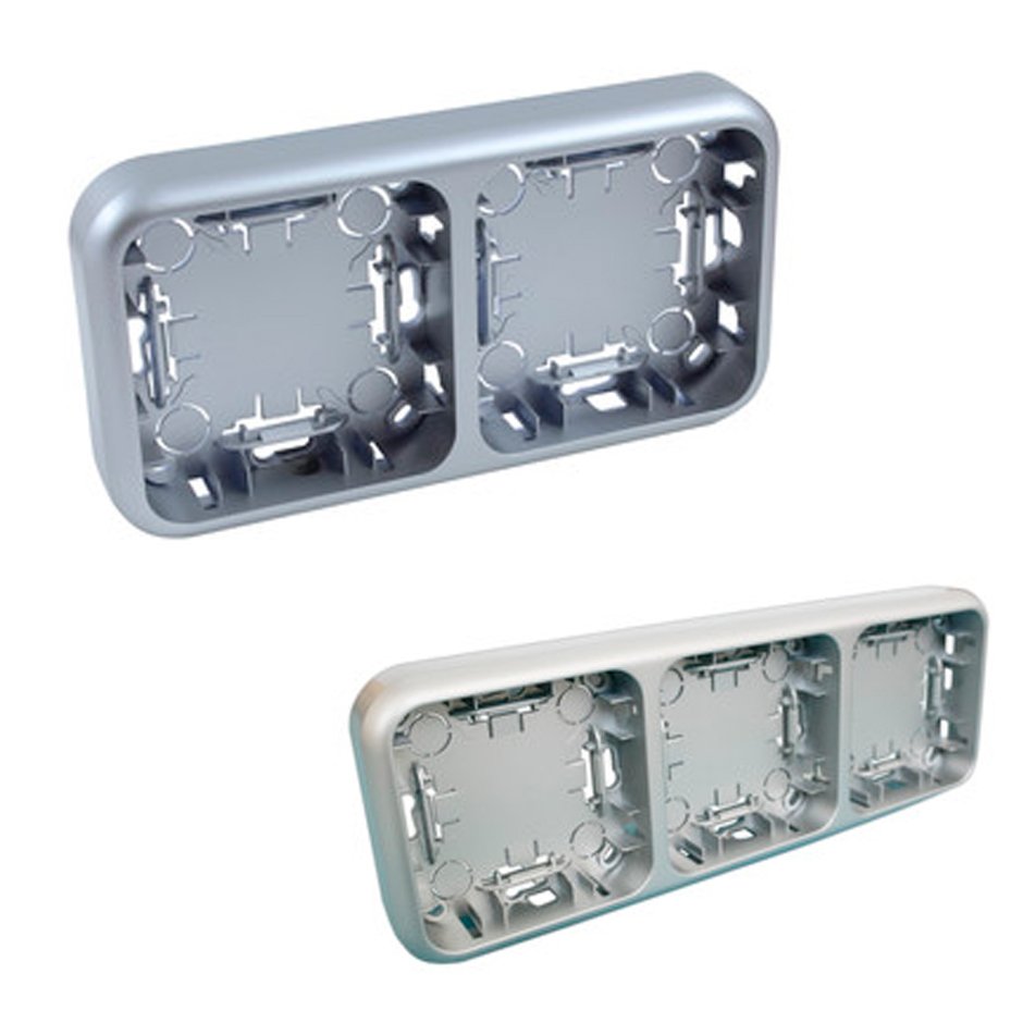 En laObra.es tenemos disponibles los mecanismos de superficie al mejor precio del mercado, aquí puede comprar el modelo marco doble superficie en plata, disponible en todos los acabados y colores.