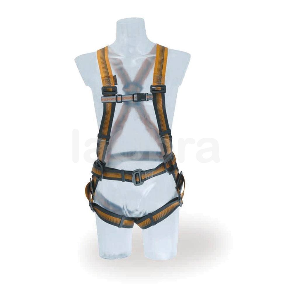 - Arnés de seguridad para trabajar en situaciones de riesgo de caída, con anilla posterior de recogida y dos anillas laterales de sujeción.